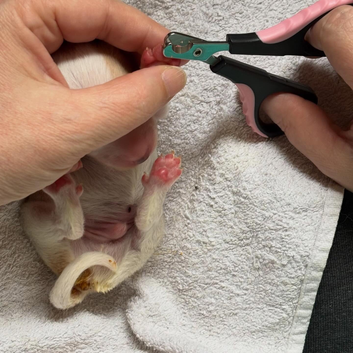 Einige Popo-Badeeinheiten und erstes Krallenschneiden (202 Krallen insgesamt) haben sie auch schon über sich ergehen lassen, so wird Dorias Gesäuge nicht zerkratzt und alles bleibt schön hygienisch.