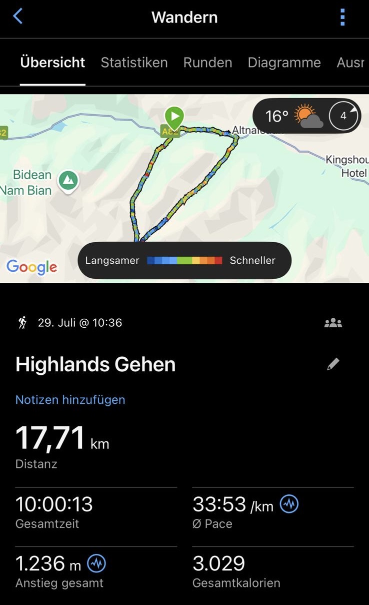 Am Ende haben wir festgestellt, dass die Geodaten nicht mit der Wanderbeschreibung übereinstimmten, denn wir hätten vor dem Farn den Weg nach links abkürzen können. So sind wir statt 15 Kilometern mit 500 Höhenmetern knapp 18 Kilometer mit gut 1.200 Höhenmetern gewandert und haben nur dezente 3 Stunden länger gebraucht als vermutet. Doch wir nahmen es mit Humor.
